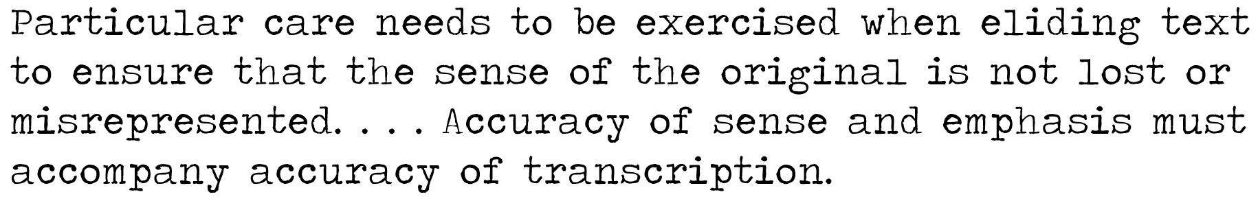 This admonition embodies the onus of the editor. When entrusted with an author’s work—be it fiction or nonfiction, literary or academic—an editor has an unequivocal responsibility to preserve the truth of that work. That truth amounts not only to factual accuracy and clear and logical presentation, but also to the author’s intent, tone, style, and voice. Put simply, ellipses embody all that good editing is and should be.